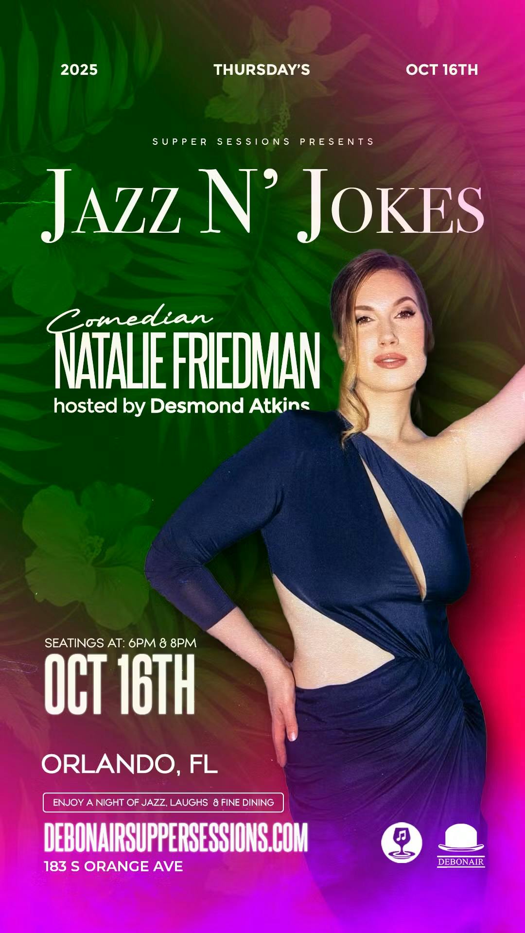 JAZZ N' JOKES Orlando, get ready for an unforgettable evening! Join us at @debonairsupperclub as comedian Natalie Friedman takes the stage, bringing her sharp wit and hilarious energy. Hosted by Desmond Atkins, this is a night where smooth jazz and belly laughs collide. 183 S Orange Ave, Orlando FL Thursday, Oct 16th Seatings at 6PM & 8PM The perfect mix of live music, comedy, and fine dining - only at Debonair Supper Sessions. Luxury, laughter, and late-night vibes await. © DebonairSupperSessions.com